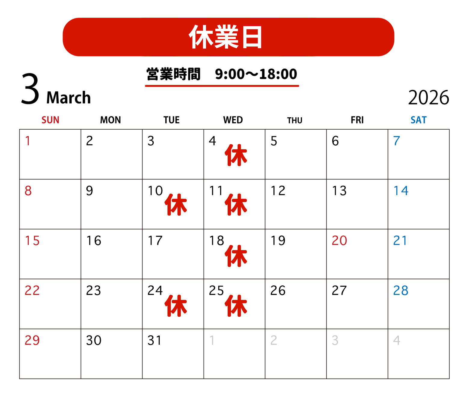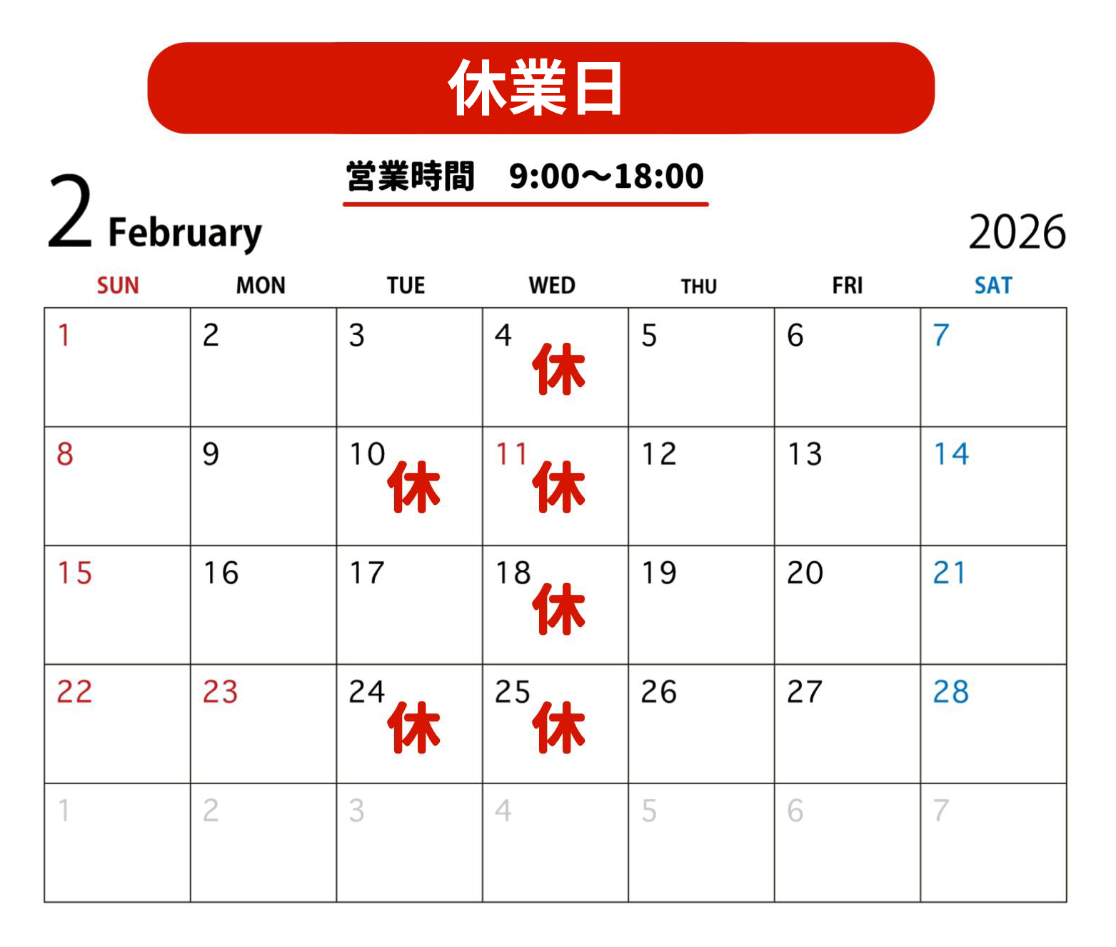定休日のご案内
